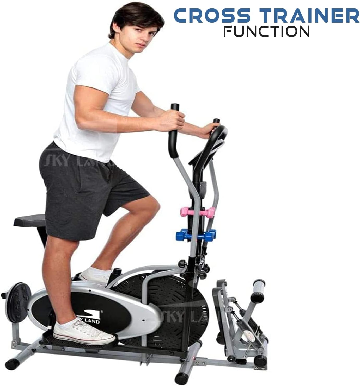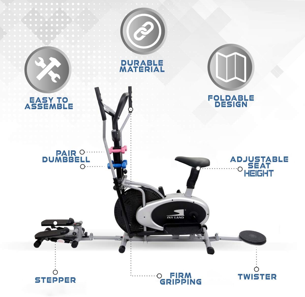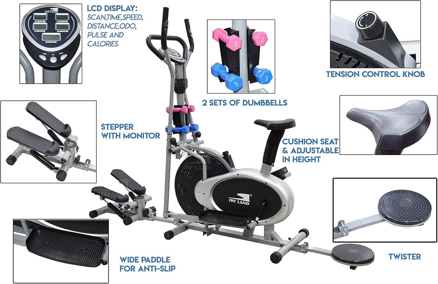 It combines an elliptical cycle, stepper, twister, dumbbells, and exercise bike for a full-body workout.
