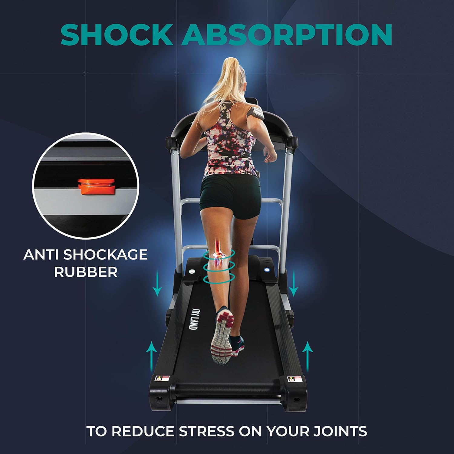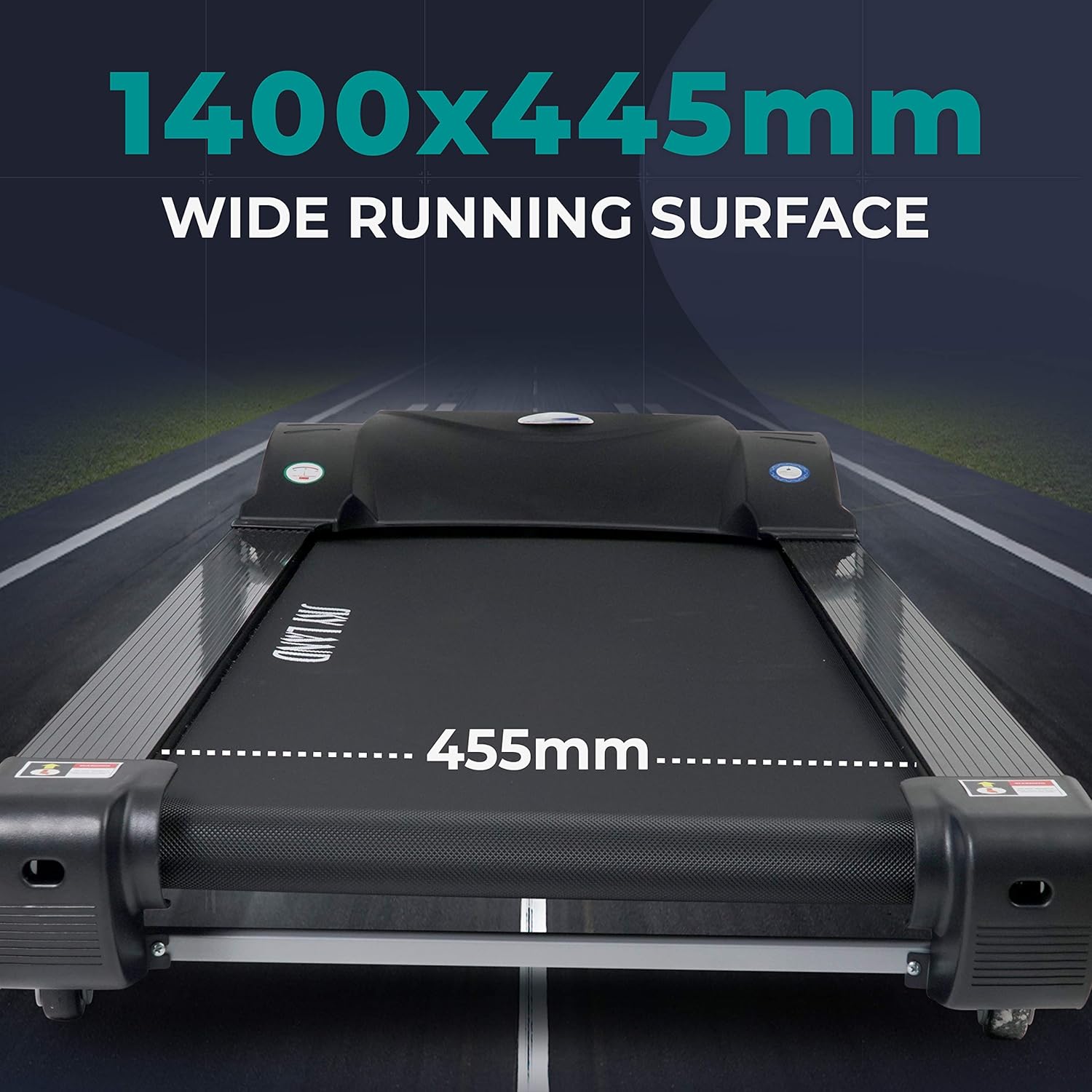ADVANCED RUNNING BELT & SHOCK ABSORPTION ?C The 1400x450mm running surface features a special friction-coated belt for enhanced traction. With shock-absorbing technology, it reduces impact on joints, making it ideal for users up to 125 kg (walking) / 100 kg (running).