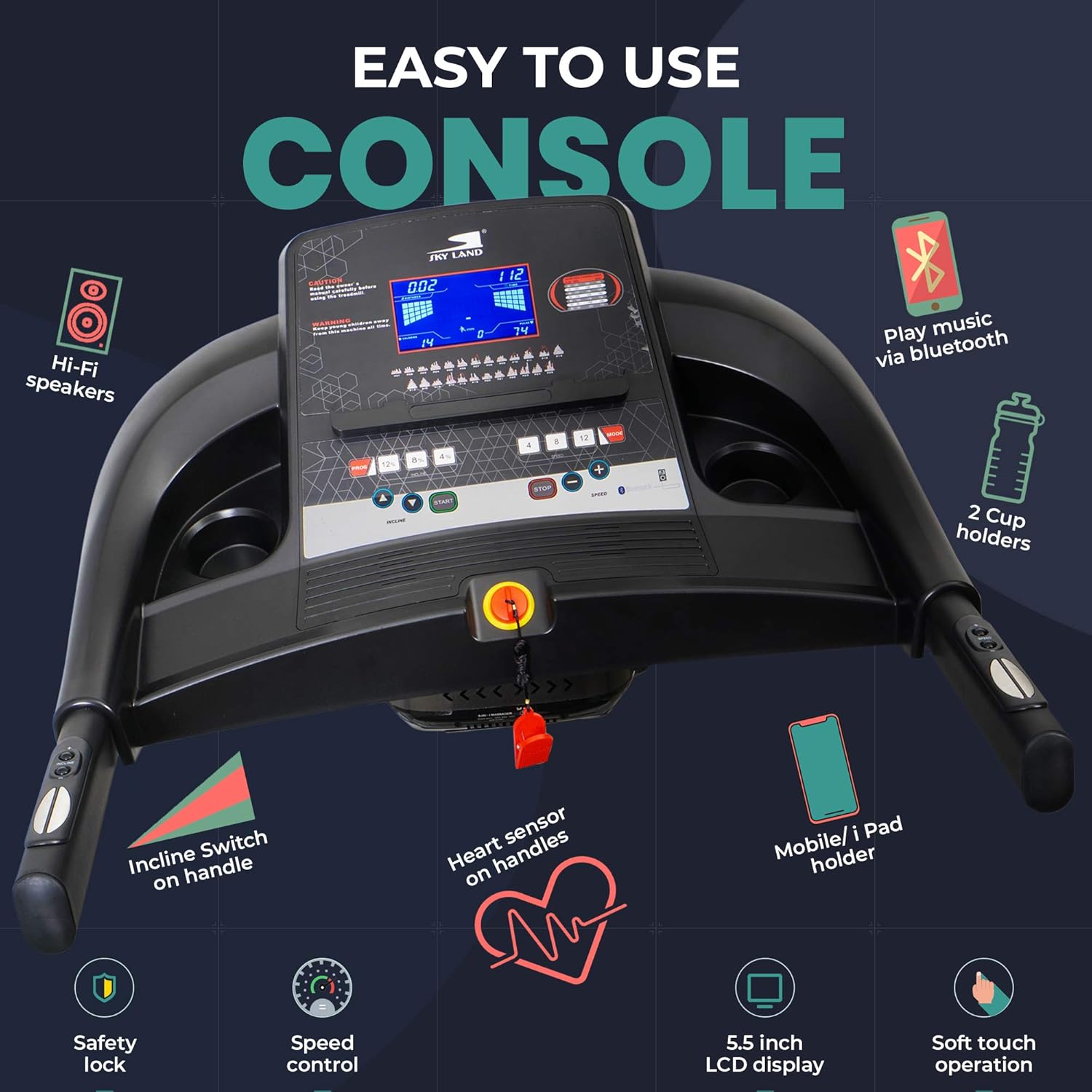 USER-FRIENDLY CONTROL PANEL & QUICK BUTTONS ?C Stay in control with the 5.5-inch LCD display, showing speed, time, distance, and calories burned. Shortcut buttons allow instant speed adjustments, while heart rate sensors on the handrail ensure a safe and efficient workout.