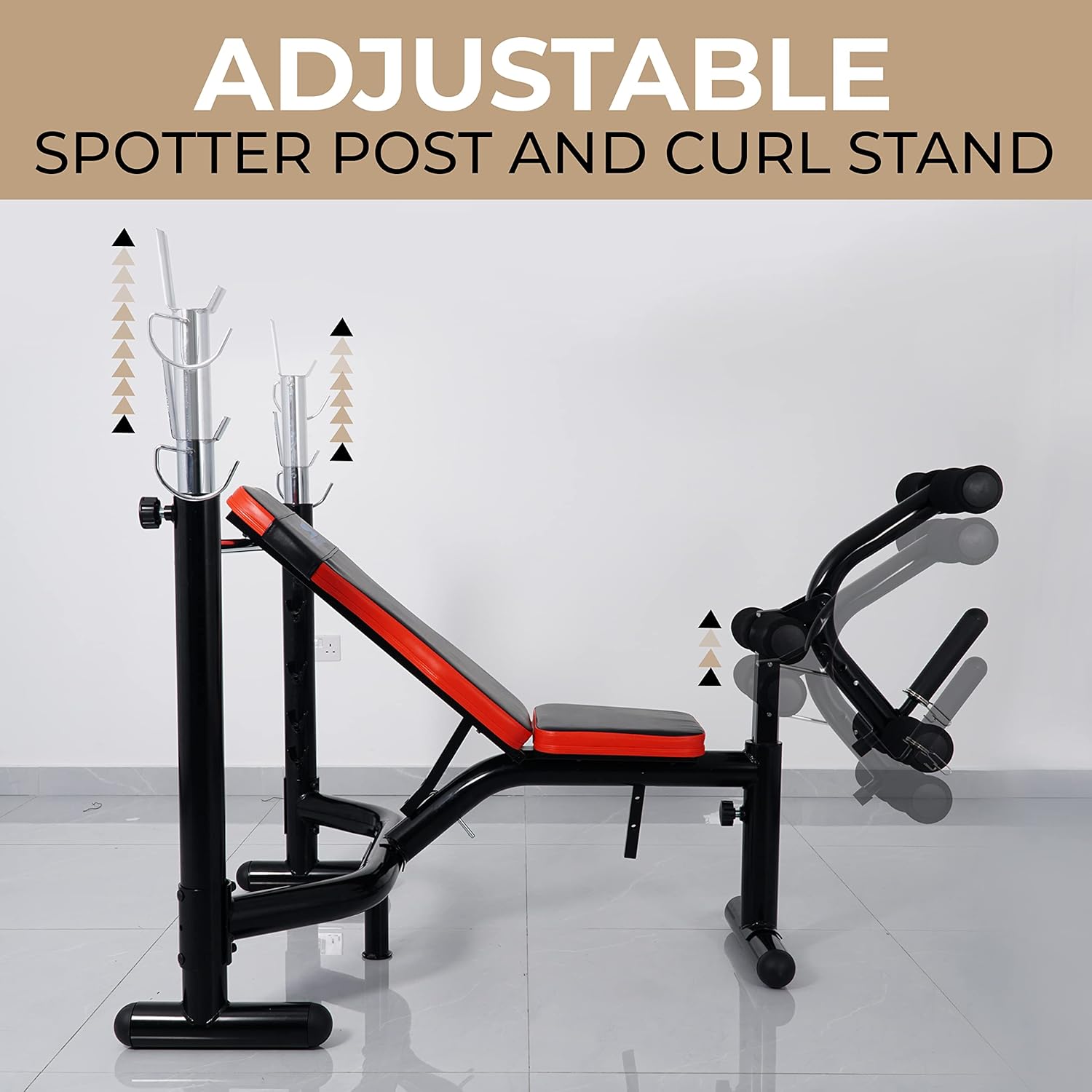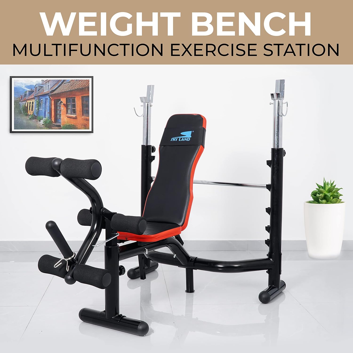 The SKY LAND EM-1831 Olympic Weight Bench features an adjustable squat rack for bench presses and squats. Supporting 240kg total capacity, this heavy-duty iron bench includes leg extensions for a complete full-body home gym.