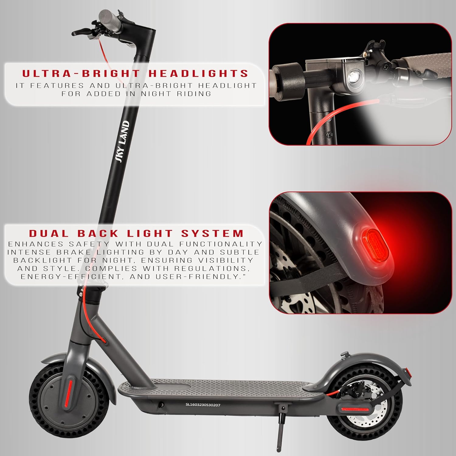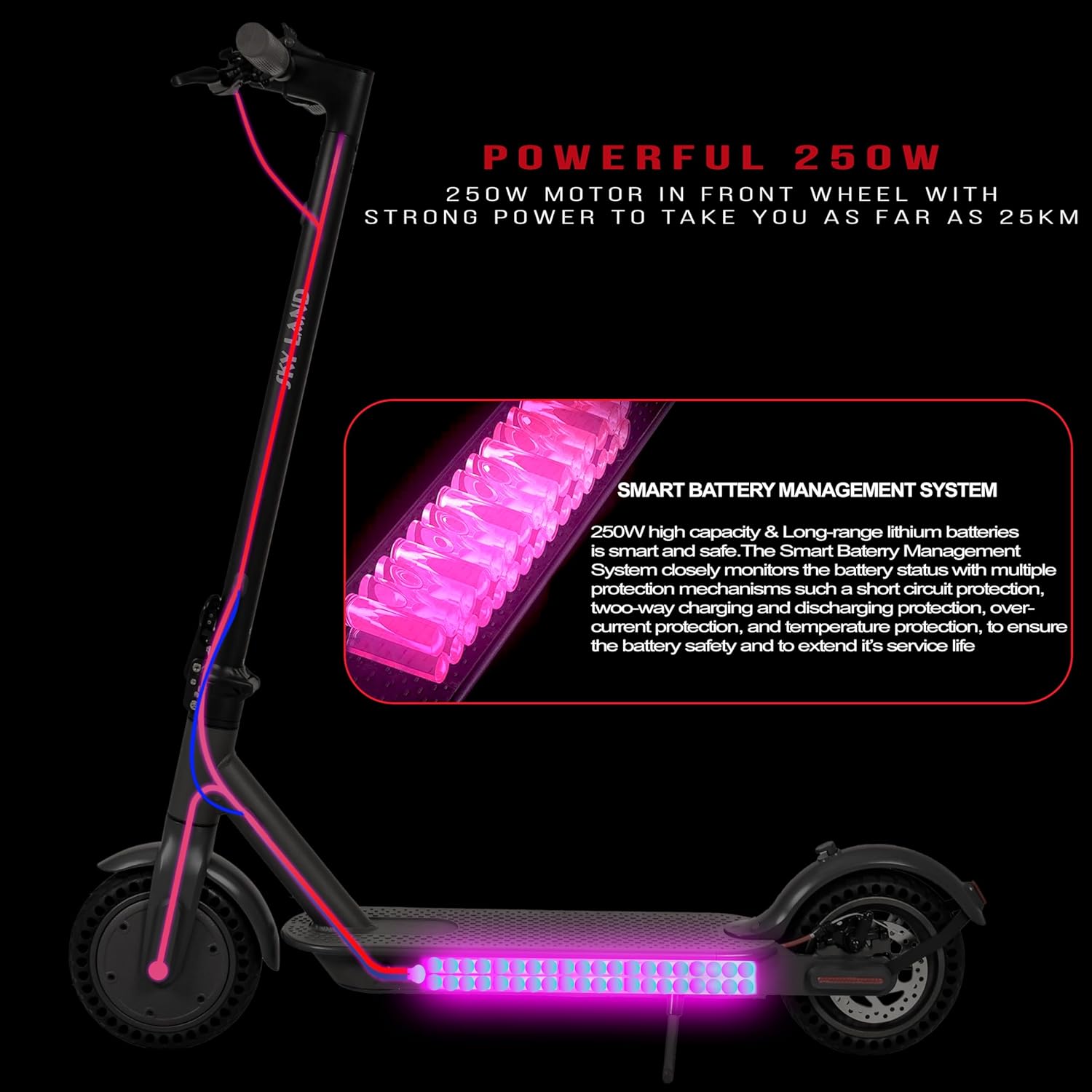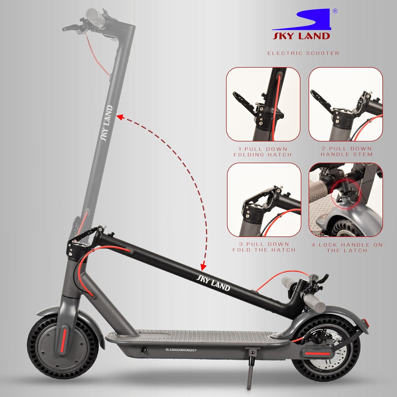 ?Minimal Design: The structure of the new SKY LAND Pro scooter is foldable and sturdy. It is also lightweight (12.5 kg), allowing you to transport it wherever you want or store it without taking up much space.