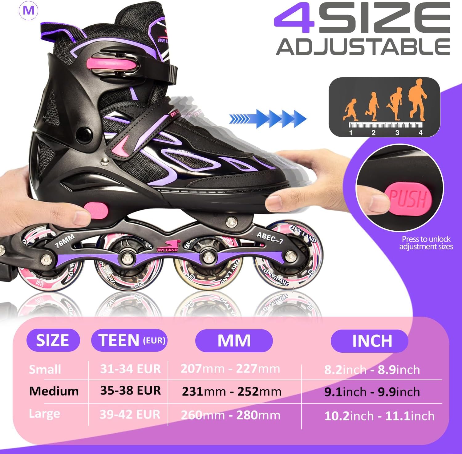 Adjustable Fit for All: Designed for both girls and boys, these inline skates are adjustable, ensuring a comfortable and secure fit for various foot sizes, making them an ideal choice for growing kids. The small size is adjustable within the EU size range of 31-34.