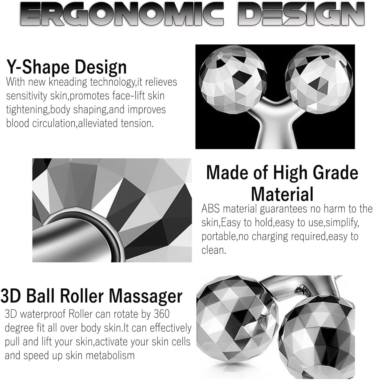 SAFE AND HEALTHFUL ?C EM-9317 Y-Shape 3D Roller, eco-friendly face massager roller. Massage beads turn 360 degrees, can be easily cleaned. Can be used by yourself anytime at your personal convenience. Daily use of the body face massager roller will make your face and skin look healthier and younger.